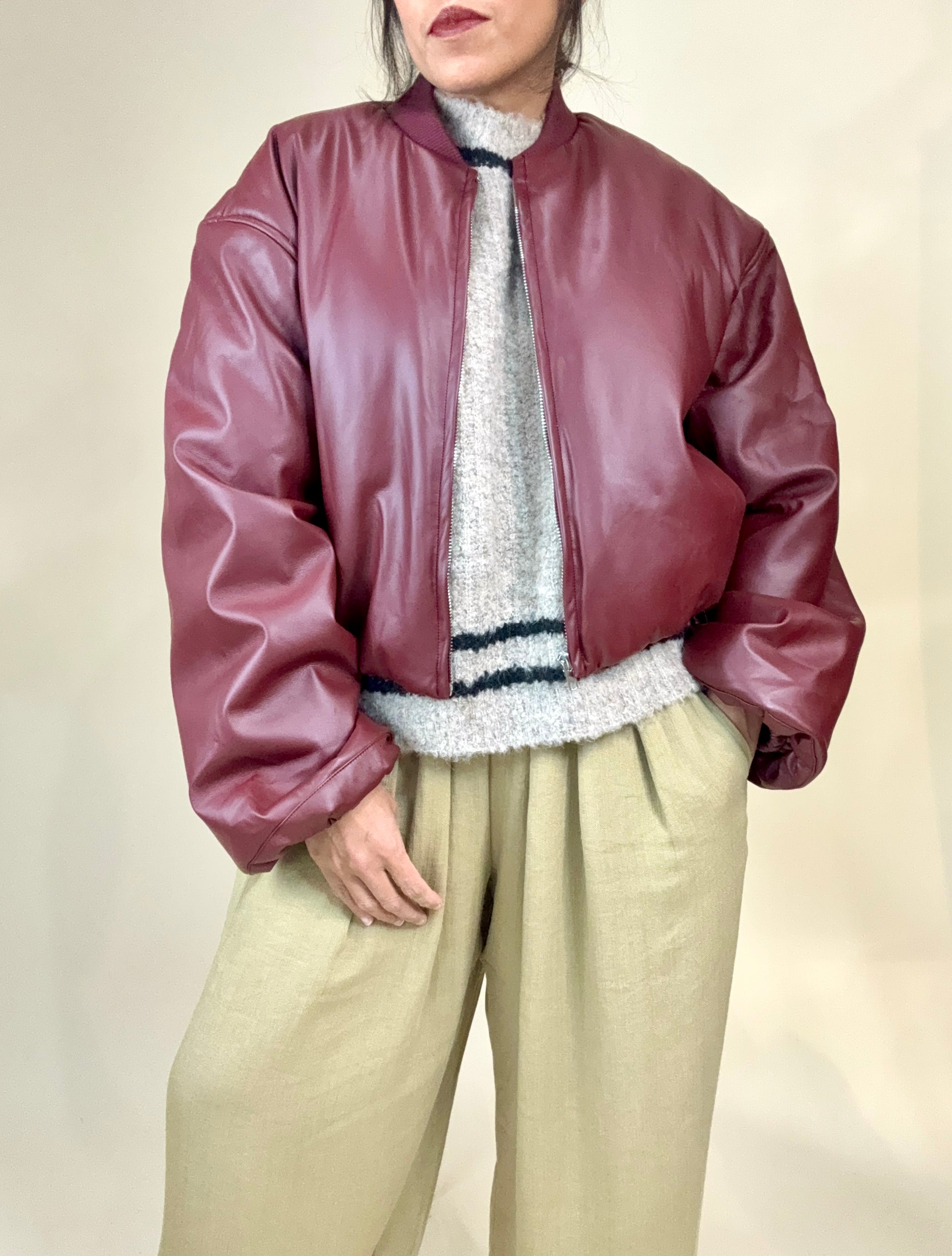 Burgundy color bomber jacket. Gorgeous to pair with anything this season!