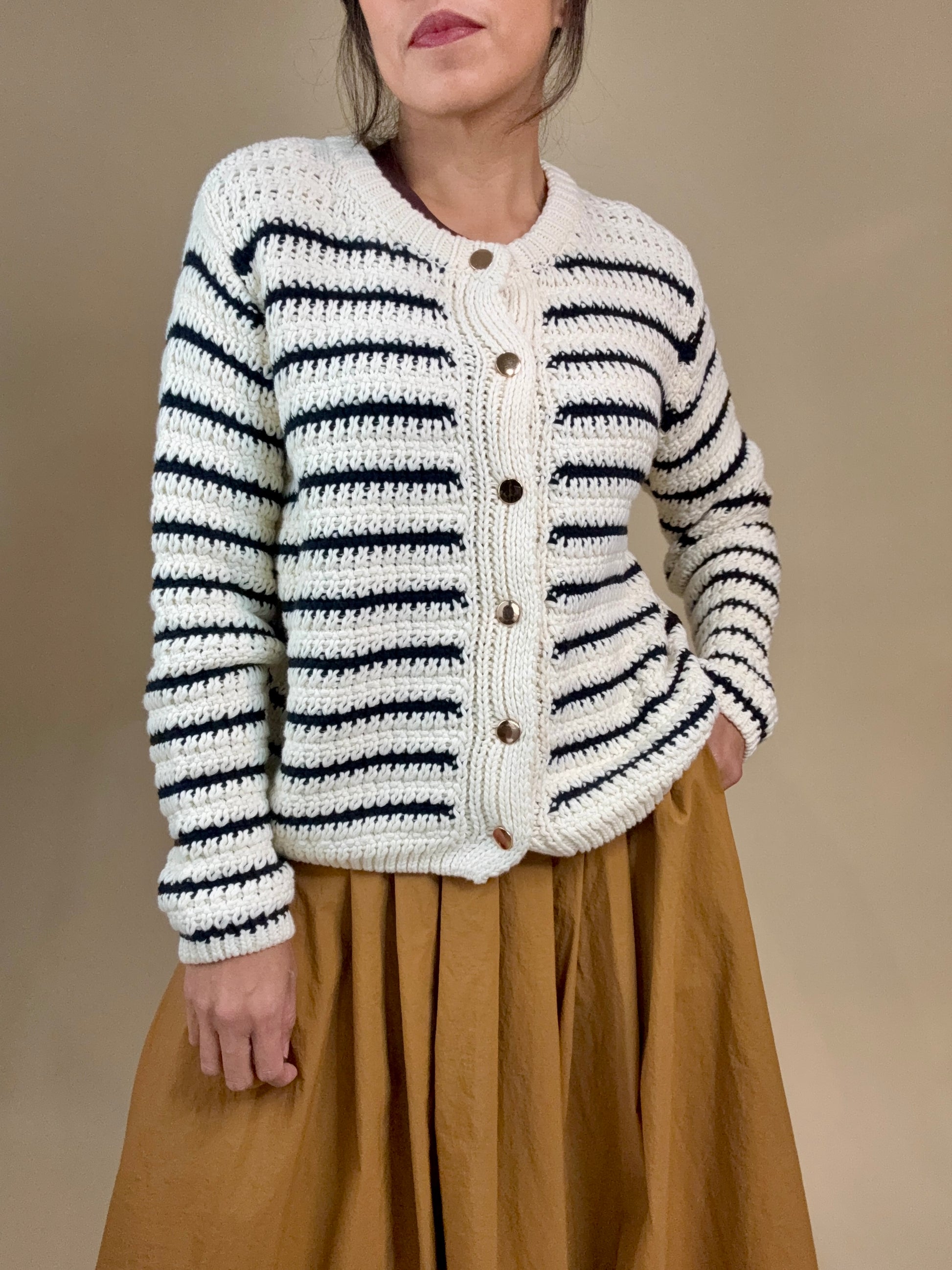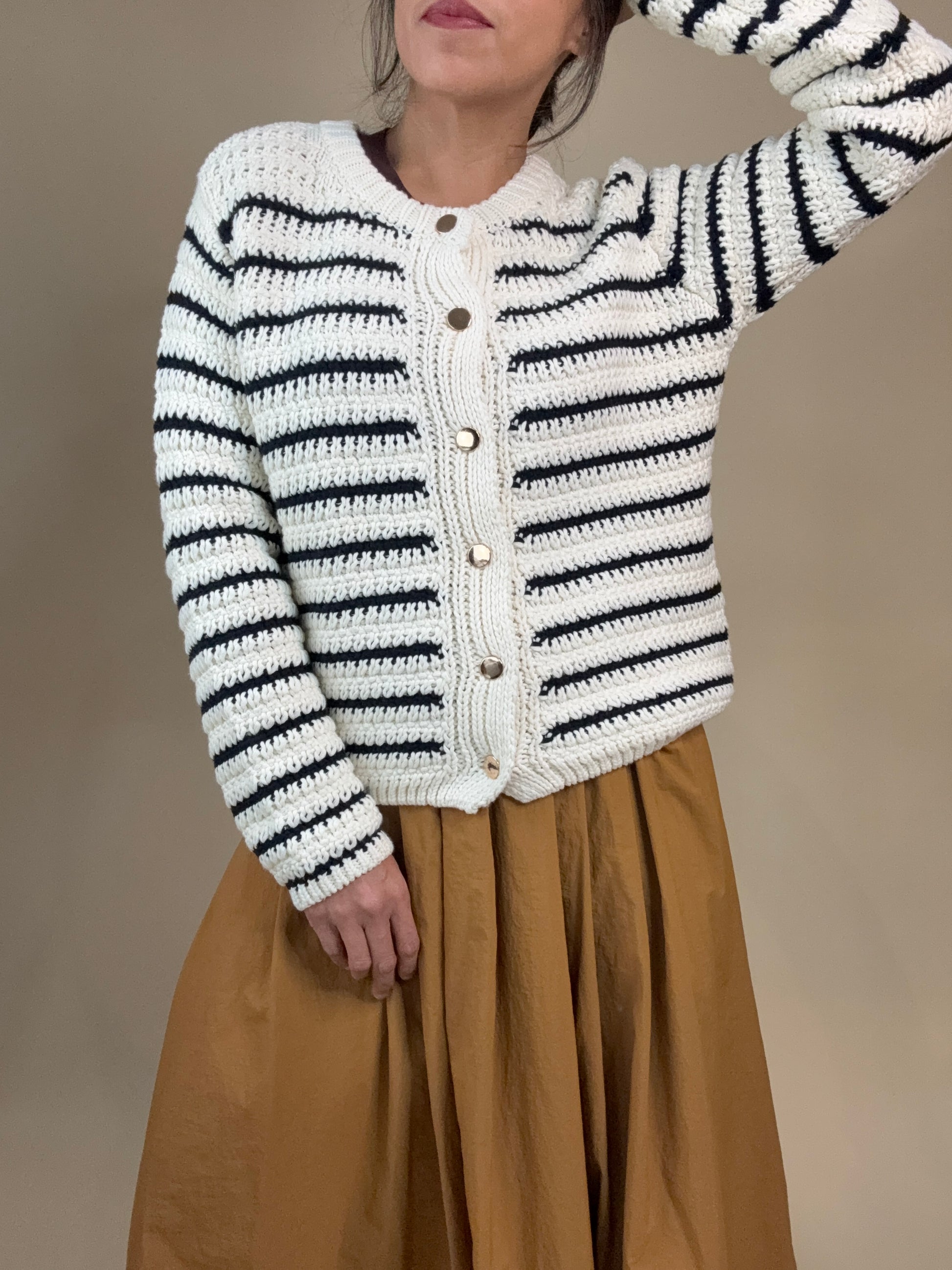 Inspired by timeless nautical style, the Marin Cotton Knit Cardigan is crafted from 100% breathable cotton for an effortlessly chic and comfortable fit. Featuring classic navy stripes on a creamy white base, this piece brings a fresh coastal touch to your everyday wardrobe. The chunky knit texture and gold-tone buttons add a refined, vintage-inspired detail that elevates even the simplest outfits.