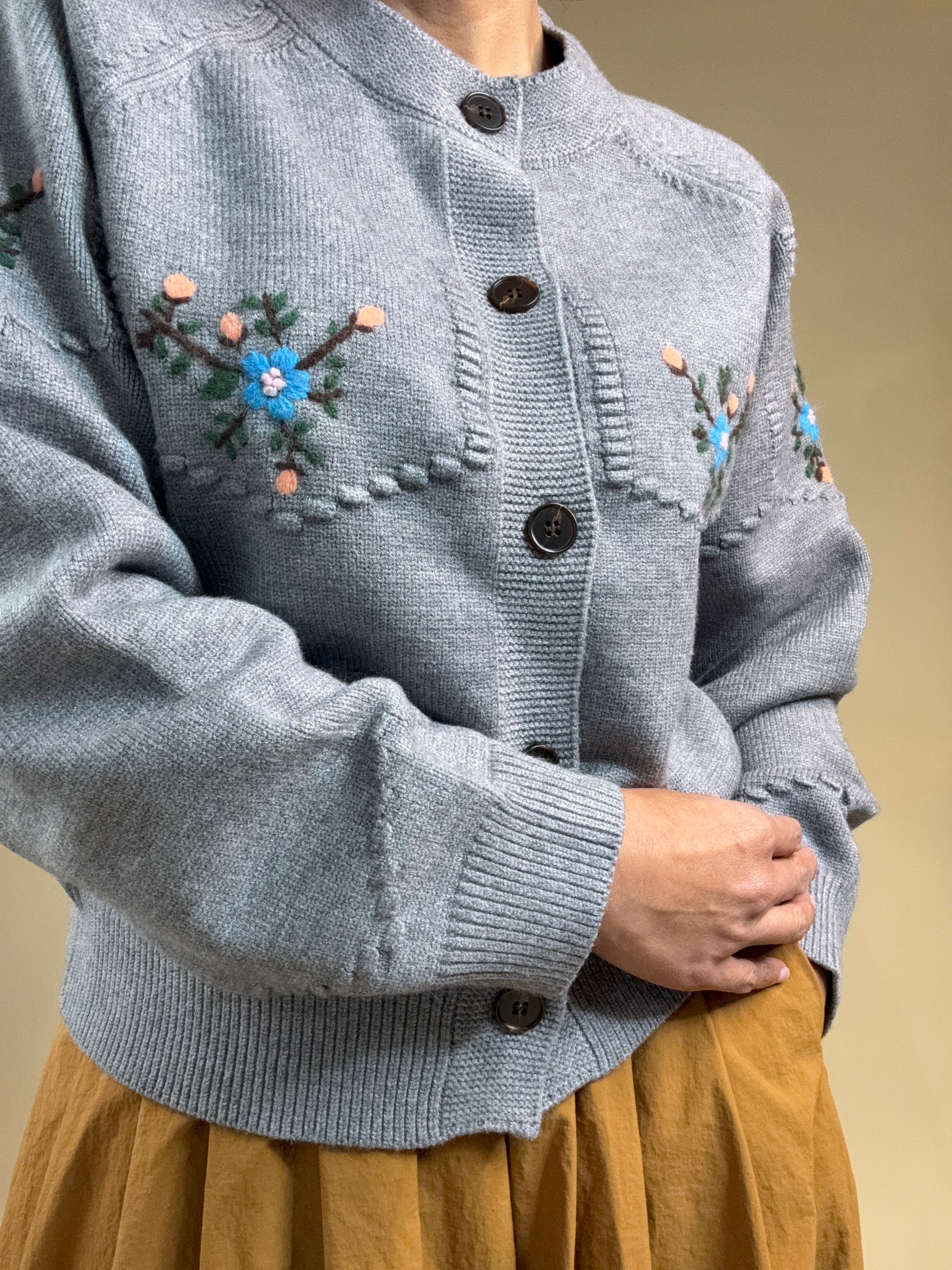 A cozy and timeless gray knit cardigan designed with delicate floral embroidery for a charming, vintage-inspired touch. It features front button closures, ribbed cuffs and hem, and subtle hand-stitched details along the seams for added texture. The slightly cropped fit pairs perfectly with dresses, skirts, or high-waisted pants — ideal for layering on cool days.